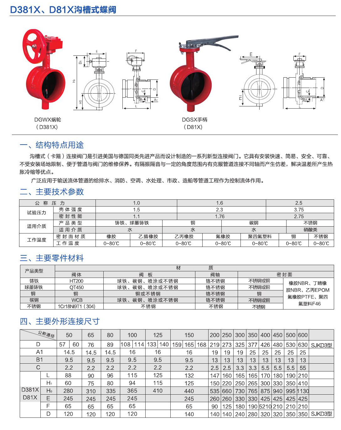 - 溝槽式(卡箍)連接閥門是引進美國與德國同類先進產(chǎn)品而設計制造的一系列新型連接閥門。它具有安裝快速、簡易、安全、可靠、不受安裝場地限制、便于管道與閥門的維修保養(yǎng)。有隔振隔音與一定的角度范圍內(nèi)有克服管道連接不同軸而產(chǎn)生仿差,解決溫差所產(chǎn)生熱賬冷縮等優(yōu)點。
