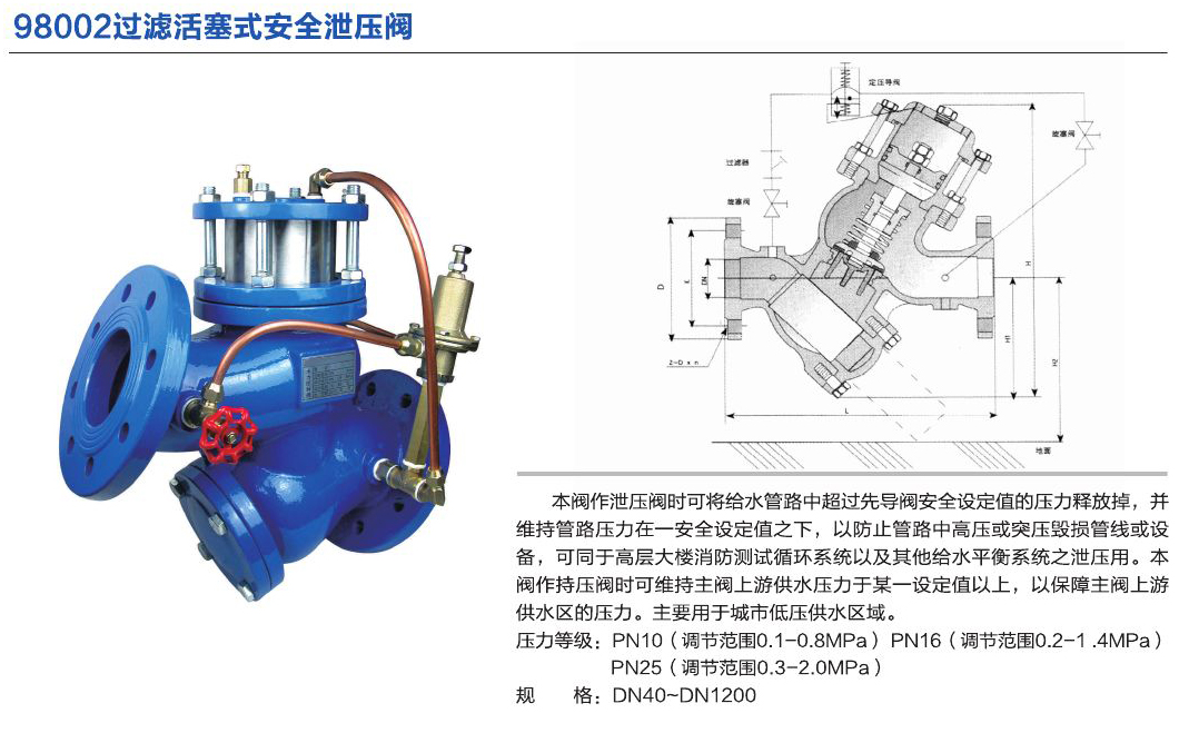 - 本閥作泄壓閥時可將給水管路中超過先導(dǎo)閥安全設(shè)定值的壓力釋放掉,并維持管路壓力在一安全設(shè)定值之下,以防止管路中高壓或突壓毀損管線或設(shè)備,可同于高層大樓消防測試循環(huán)系統(tǒng)以及其他平衡系統(tǒng)之泄壓用。