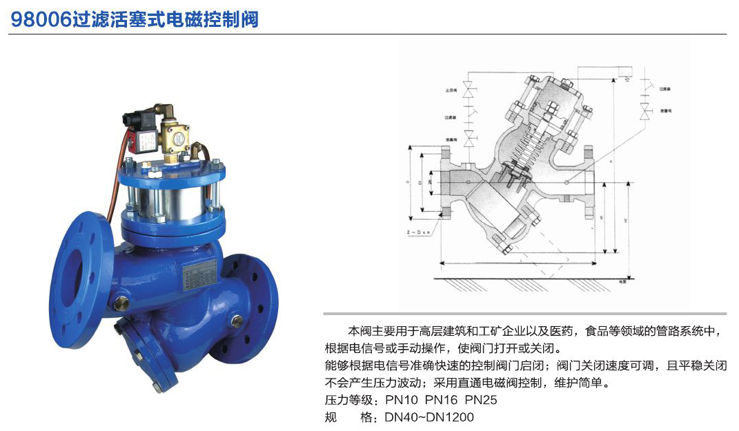 - 本閥主要用于高層建筑和工礦企業(yè)以及醫(yī)藥,食品等領(lǐng)域的管路系統(tǒng)中,根據(jù)電信號或手動操作,使閥門打開或關(guān)閉。