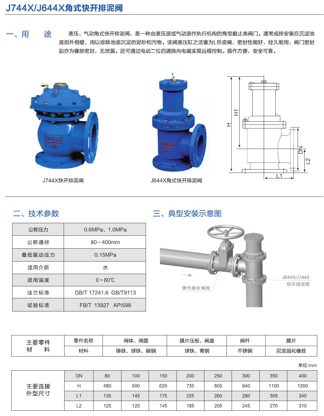 - 液壓、氣動角式快開排泥閥,是一種由液壓源或氣動源作執(zhí)行機構(gòu)的角型截止類閥門。