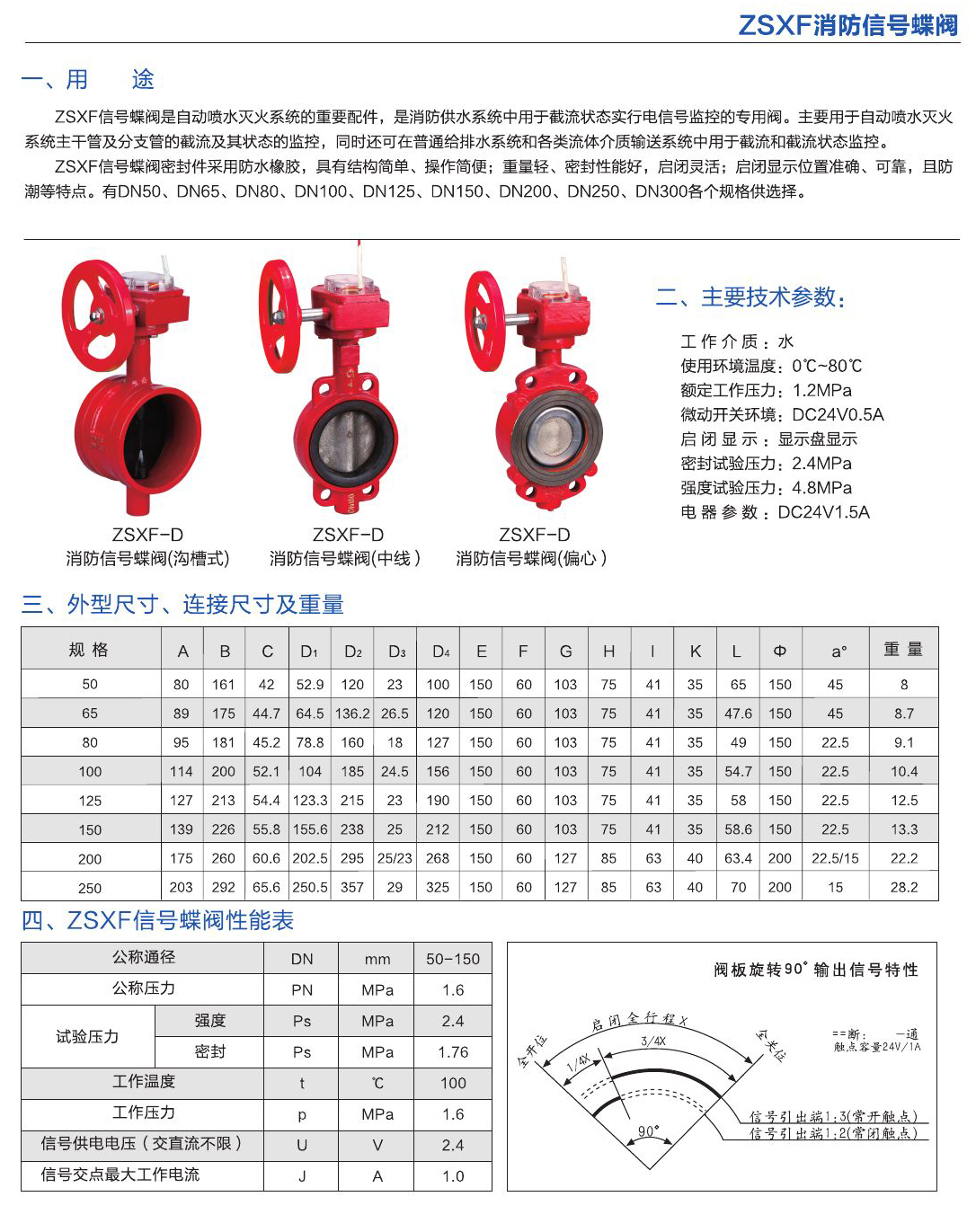 - ZSXF信號蝶閥是自動噴水滅火系統(tǒng)的重要配件,是消防供水系統(tǒng)中用于截流狀態(tài)實(shí)行電信號監(jiān)控的專用閥。主要用于自動噴水滅火系統(tǒng)主干管及分支管的截流及其狀態(tài)的監(jiān)控,同時還可在普通給排水系統(tǒng)和各類流體介質(zhì)輸送系統(tǒng)中用于截流和截流狀態(tài)監(jiān)控。